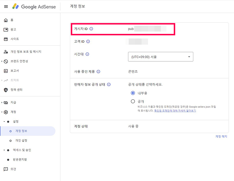 자신의 pub id는 구글애드센스 > 계정 > 설정 > 계정 정보에서 확인할 수 있습니다.